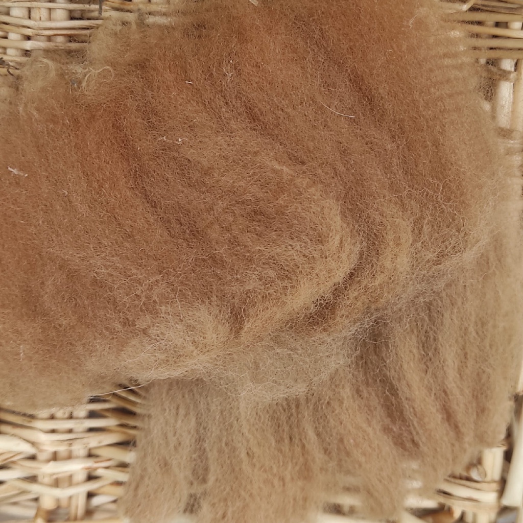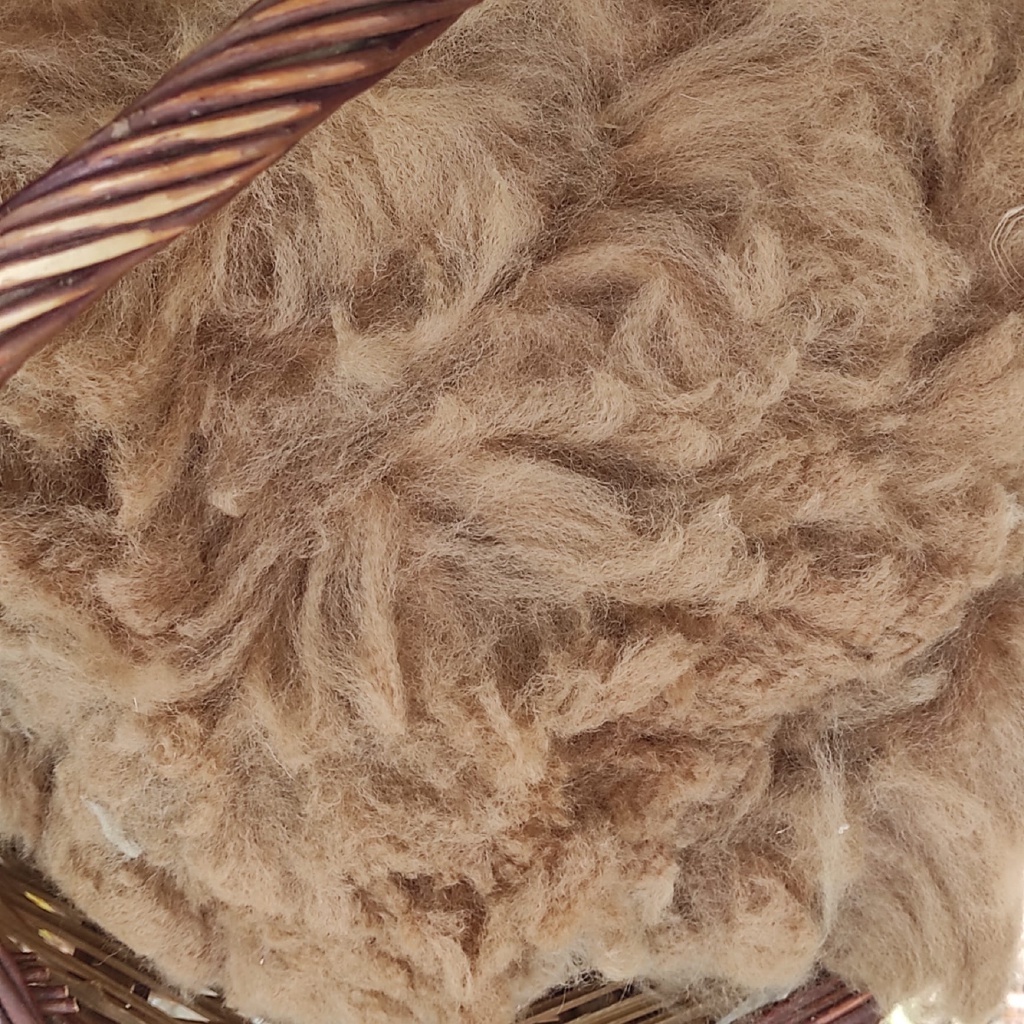 Fibra baby alpaca de color marró clar. Extra suau i molt llarga. Fibra únicament tallada, sense rentar ni cardar.