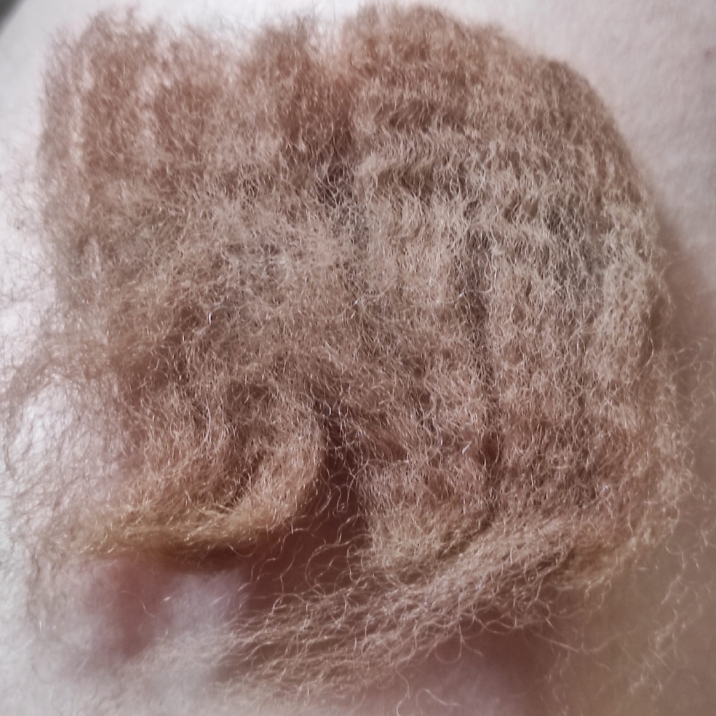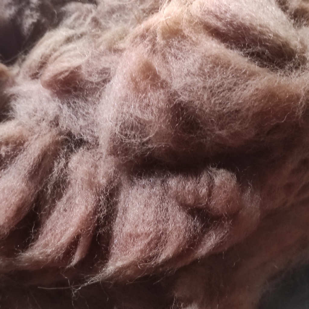 Fibra de color marró mig. Molt densa i suau i de bona longitud. Fibra únicament tallada, sense rentar ni cardar. Preu cada 50 grams.
